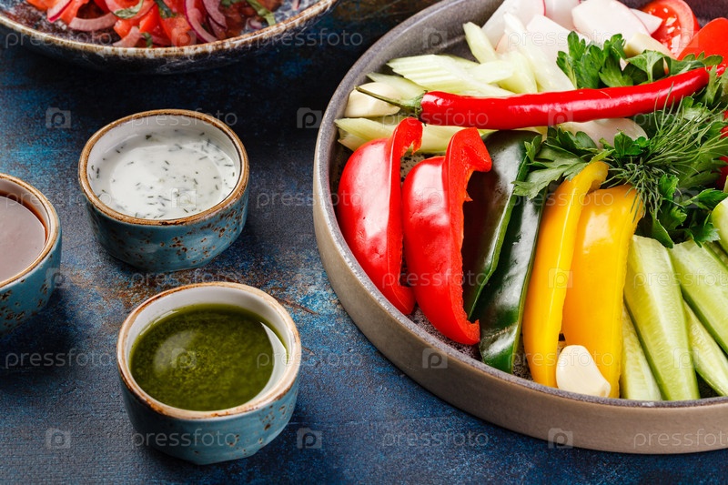 Блюдо с овощами, перцем, помидорами и зеленью и различными соусами