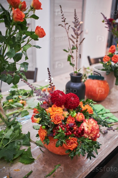 Осенний букет в вазе из тыквы. Красивый цветочный декор на День Благодарения и Хэллоуин. Уютная домашняя атмосфера, осенний декор