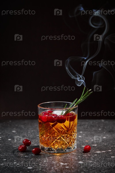 Напиток с клюквой и розмарином, виски, текилой или коньяком, лимонадом, алкогольным или безалкогольным коктейлем на темном столе