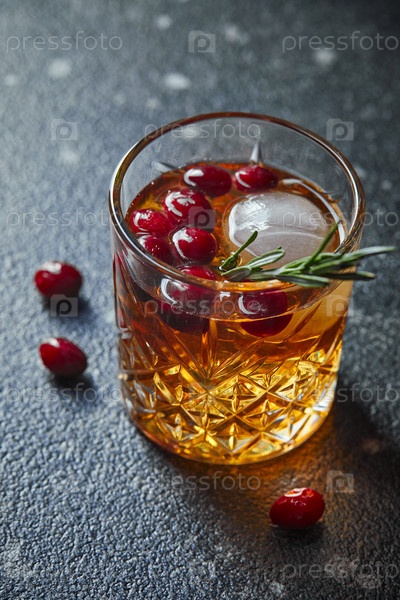 Напиток с клюквой и розмарином, виски, текилой или коньяком, лимонадом, алкогольным или безалкогольным коктейлем на темном столе