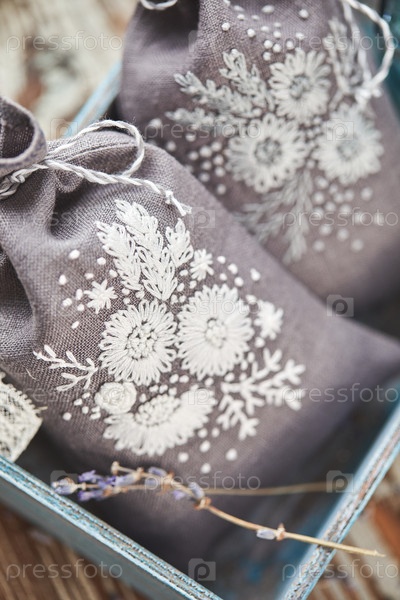 Саше с вышивкой, наполненные лавандой на деревянном фоне