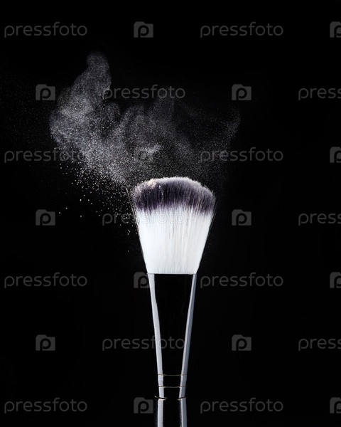 Профессиональные черные кисти для макияжа с бежевой пудрой в движении и рыхлыми частицами пудры, разбросанными вокруг в виде облака