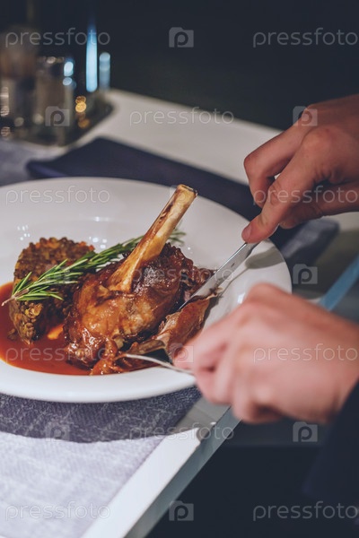 Руки человека едят изысканное блюдо высокой кухни за столом в ресторане