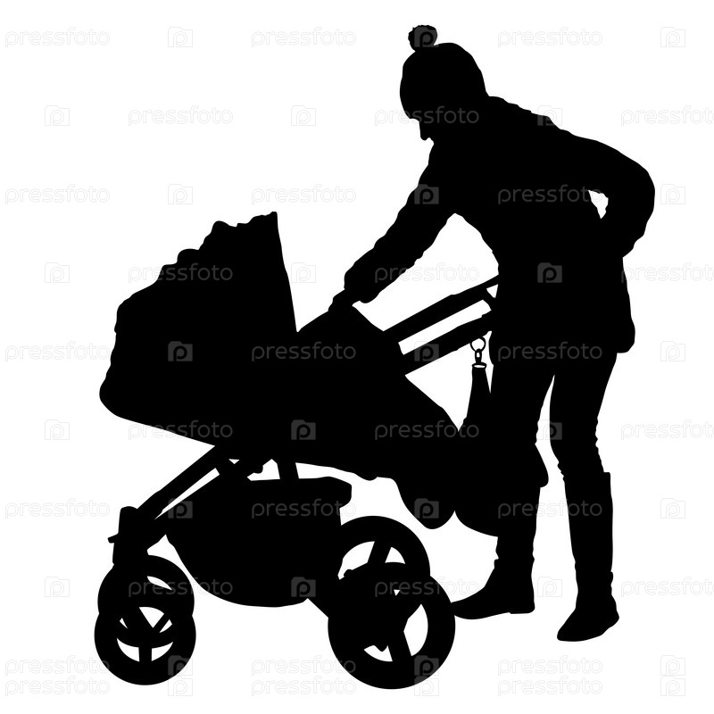 Силуэты гуляющих матерей с детскими колясками на белом фоне