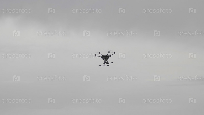 Летающий вертолет-дрон на фоне белых облаков