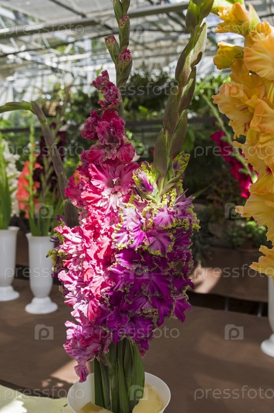 Букеты из красивых разноцветных гладиолусов. Выставка гладиолусов в оранжерее Аптекарского Огорода (филиал ботанического сада МГУ). Москва