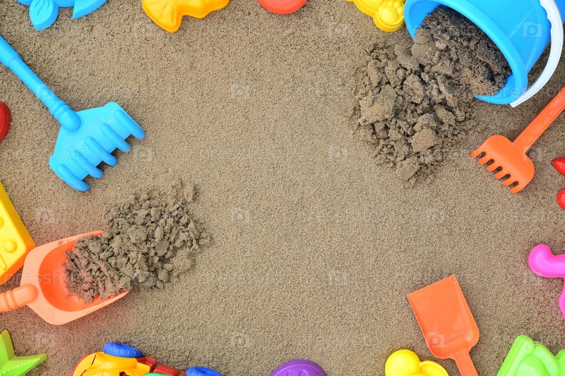 Детская песочница с различными игрушками для игры. Песочно-желтый фон. Концепция семейного отдыха у моря с детьми