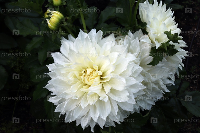 Великолепные белоснежные садовые цветы георгины после дождя