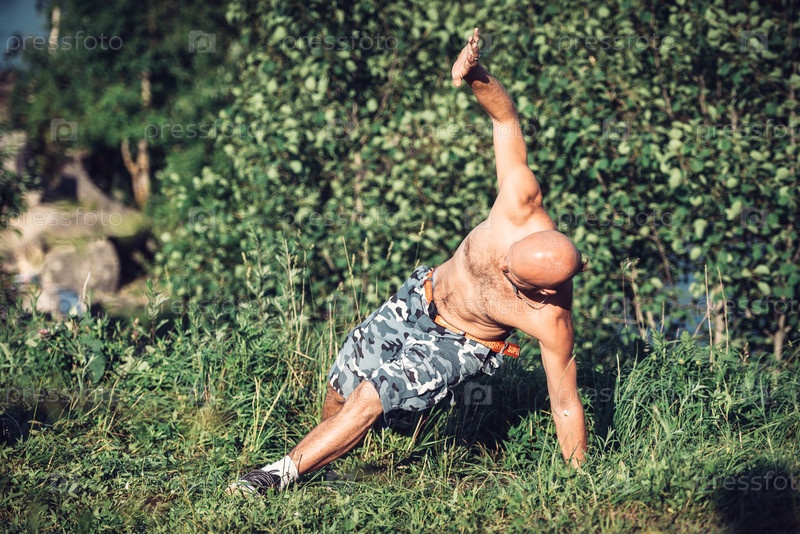 Россия, Санкт-Петербург, 24 июня 2020 года: Мускулистый мужчина с обнаженным туловищем летом занимается спортом на природе