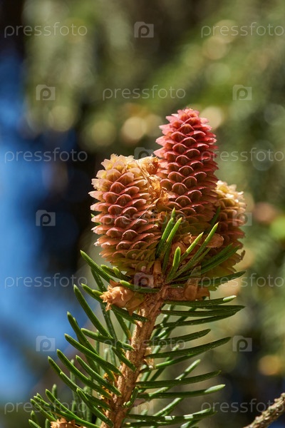 Ель весной в саду. Формируются еловые шишки