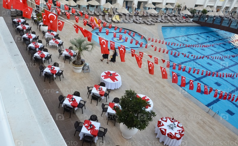 Столы в ресторане оформлены в турецком стиле. Турецкие национальные флаги