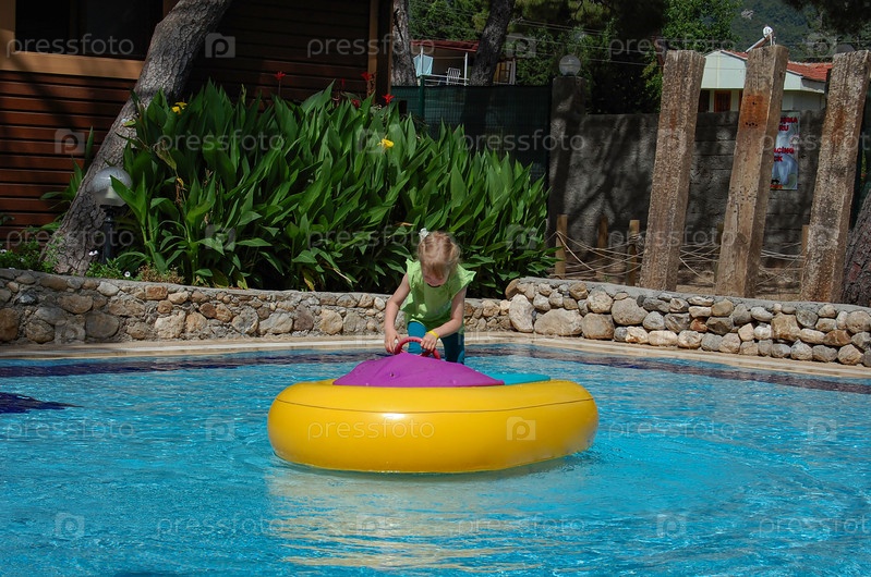 Маленькая девочка 4-6 лет катается на надувной лодке. Отдых, праздники. Ребенок с надувным игрушечным кольцом плавает в бассейне. Маленькая девочка учится плавать и нырять в открытом бассейне тропического курорта. Плавание с детьми. Здоровый спорт для дет