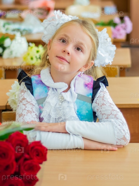 Впервые в первом классе! Первоклассница в красивой элегантной современной школьной форме на День знаний в школе