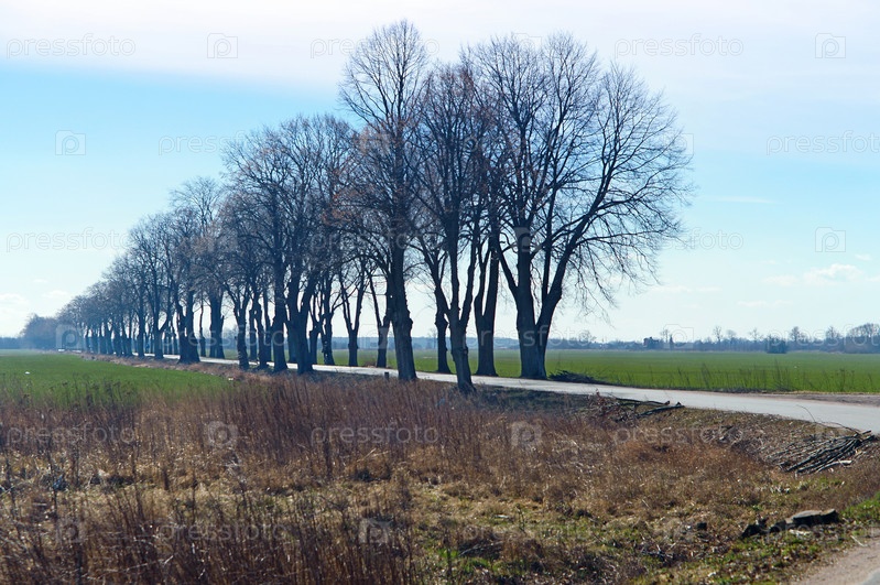 Деревья в ряд вдоль дороги, ровный ряд больших деревьев по обочинам дороги