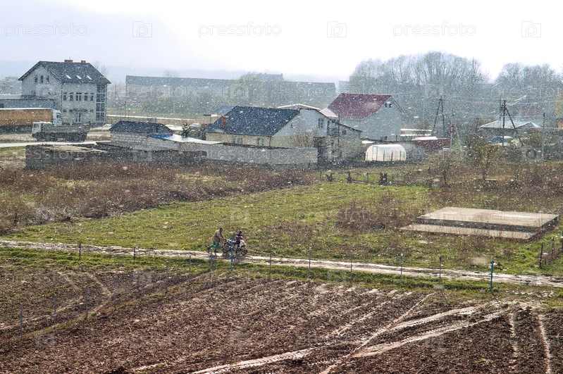 Ненастная погода, снег, дождь, мужчины толкают мотоцикл на проселочной дороге
