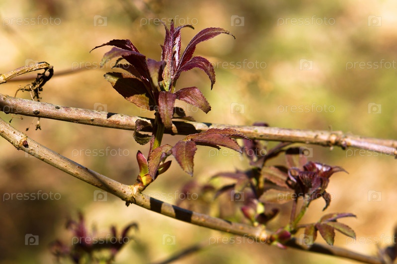 Сначала листья на дереве весной, молодые красные листья на кусте весной