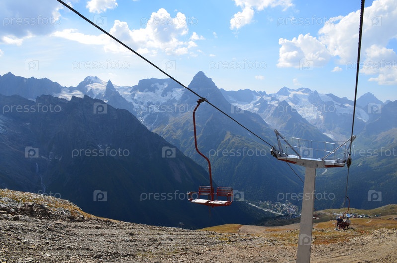 Старая канатно-кресельная дорога в Домбае на фоне гор и голубого неба
