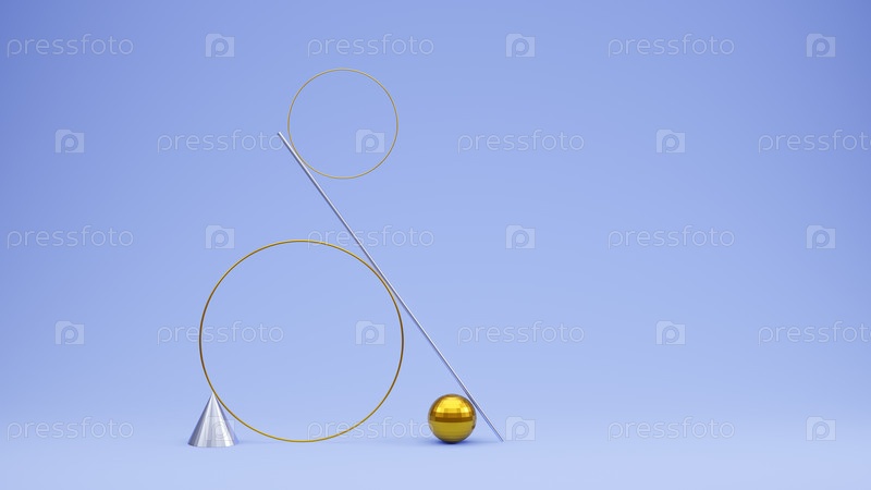 Сбалансированный натюрморт с геометрическими фигурами на синем фоне, 3D-рендеринг
