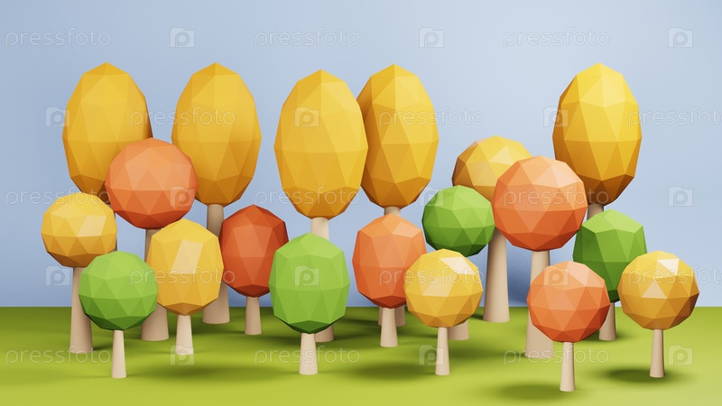 3D-рендеринг низкополигонального осеннего леса с разноцветными листьями