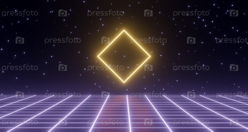 3D-рендеринг, неоновая светящаяся геометрическая форма, ретрокаркасный плакат