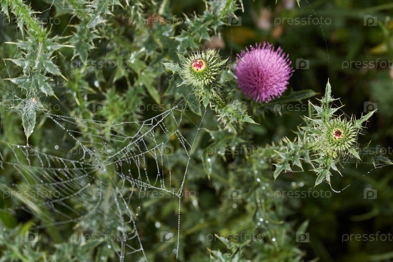 Утренняя роса на соцветиях чертополоха. род растений семейства Сложноцветные, или Сложноцветные Ранним утром на берегу озера
