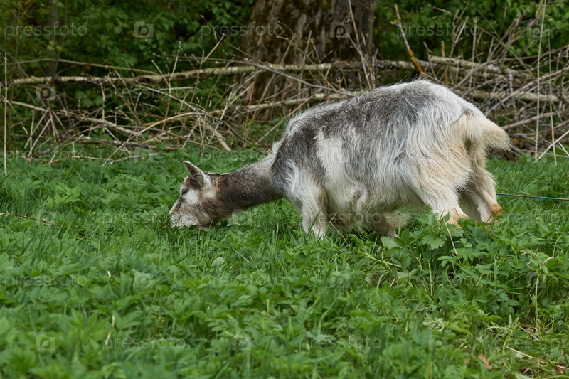 Весна. Коза пасется на лугу в теплый майский день