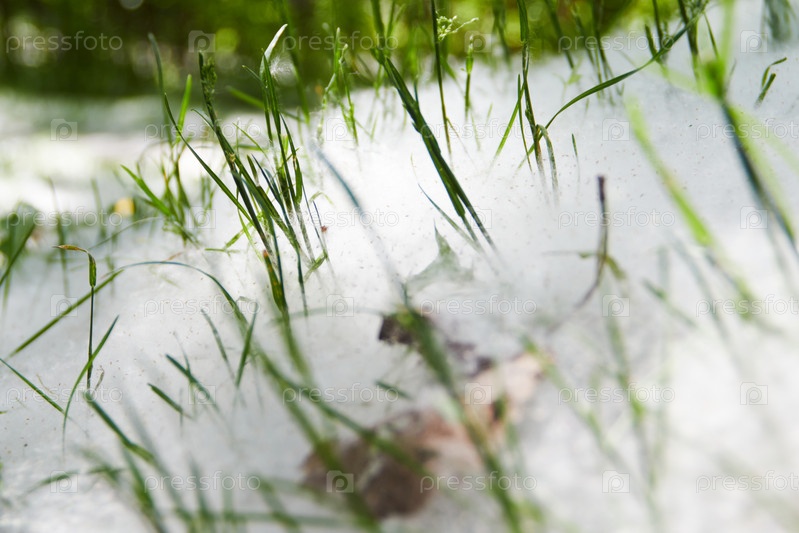 Тополиный пух среди травы, вид крупным планом