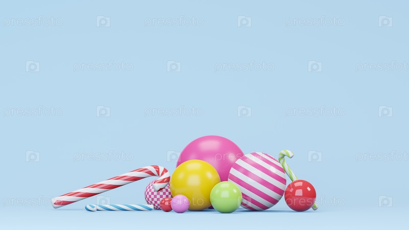 Разноцветные новогодние игрушки на голубом фоне, пустое место для текста, 3д рендер