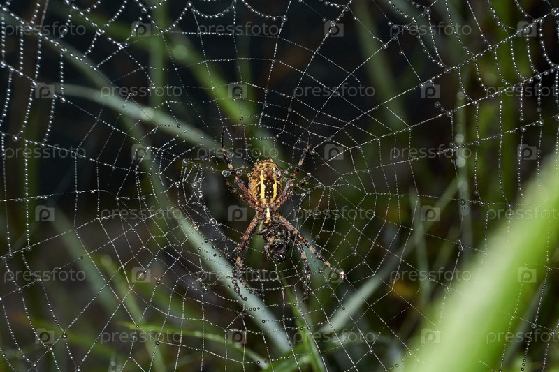 Паук и паутина в росе в сильном тумане на рассвете