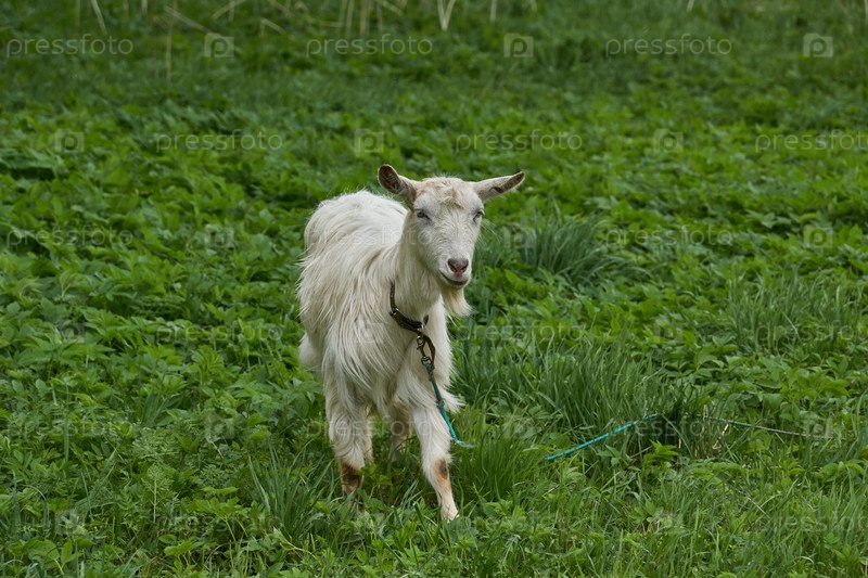 Весна. Коза пасется на лугу в теплый майский день