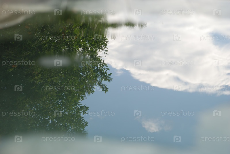 Отражение высоких зеленых деревьев в луже воды