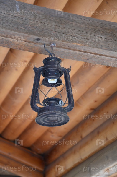 Старая керосиновая лампа подвешена к потолочной балке