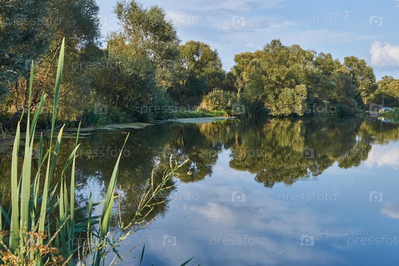Рыбалка на озере. Отражение в воде. База отдыха
