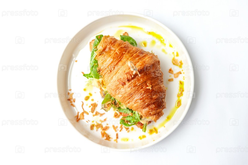 Круассан с сыром и овощами в белой тарелке. Вид сверху на белый стол