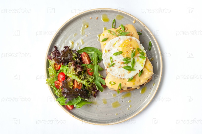 Набор блюд на завтрак: круассаны, тосты, яичница, салат, брускетта