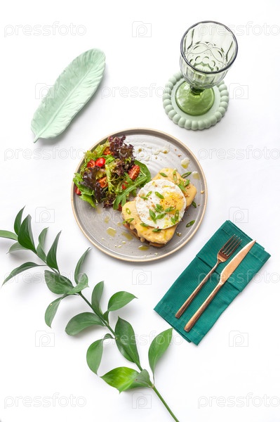 Набор блюд на завтрак: круассаны, тосты, яичница, салат, брускетта