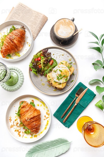 Набор блюд на завтрак: круассаны, тосты, яичница, салат, брускетта