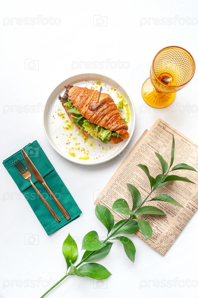 Круассан с сыром и овощами в белой тарелке. Вид сверху на белый стол