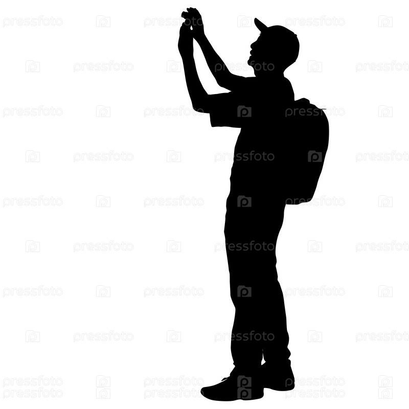 Силуэты мужчины, делающего селфи со смартфоном на белом фоне