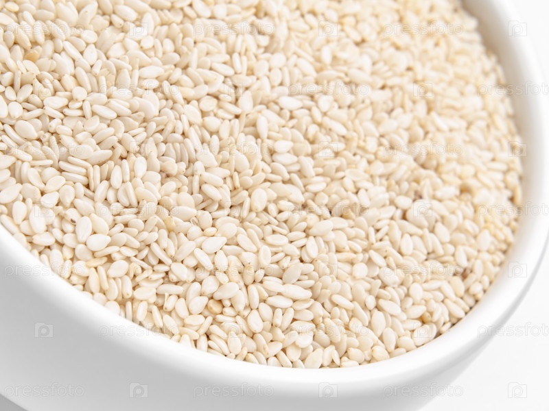 Белый кунжут крупным планом на всю рамку в белой миске. Селективный фокус. Горизонтальный