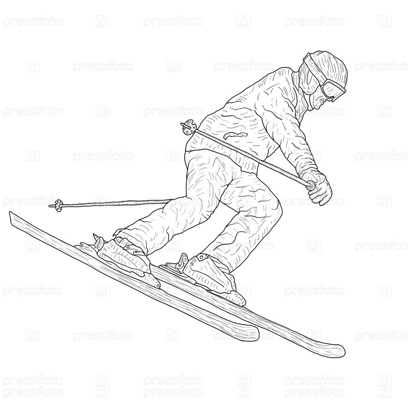 Эскиз силуэта лыжника по горному слалому на белом фоне