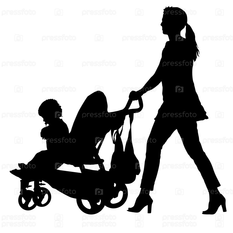 Силуэты гуляющих матерей с детскими колясками на белом фоне