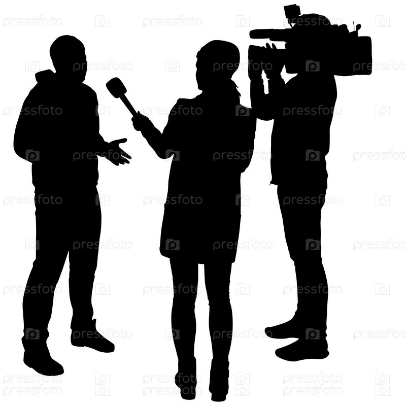 Оператор силуэта удаляет журналиста с микрофоном на белом фоне