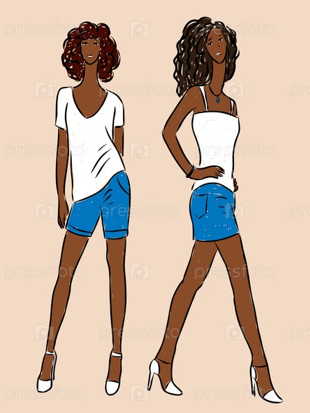Векторное изображение молодых модниц в джинсовой юбке и шортах