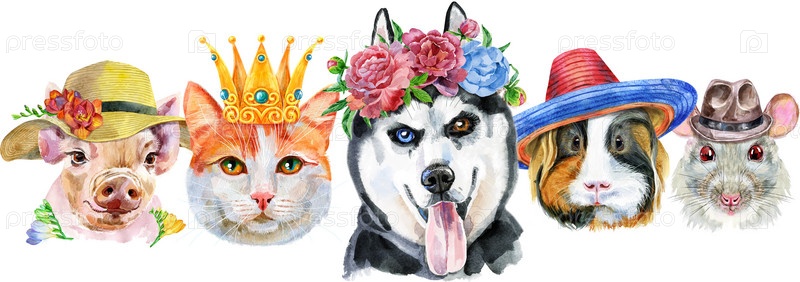 Граница с домашними животными. Ручная роспись акварелью, изолировать клип-арт на белом фоне. Дизайн баннера