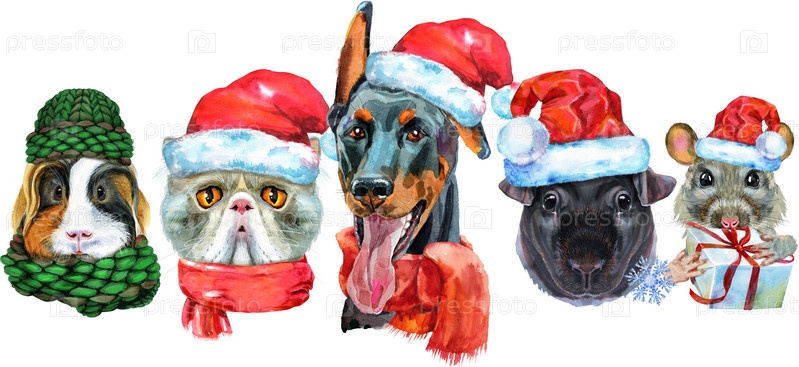 Граница с домашними животными. Ручная роспись акварелью, изолировать клип-арт на белом фоне. Дизайн баннера