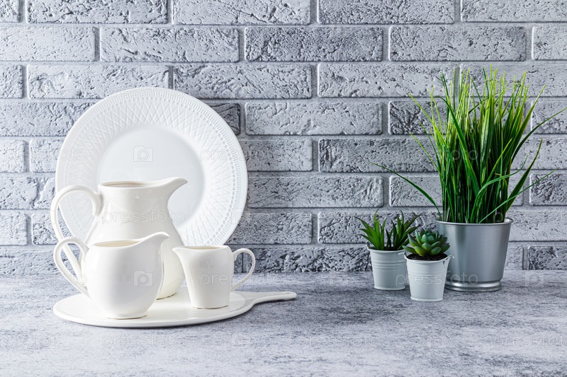 Белая кухонная утварь на мраморно-серой столешнице на фоне кирпично-серой стены. Комнатные растения в стильных горшках. Современный интерьер кухни