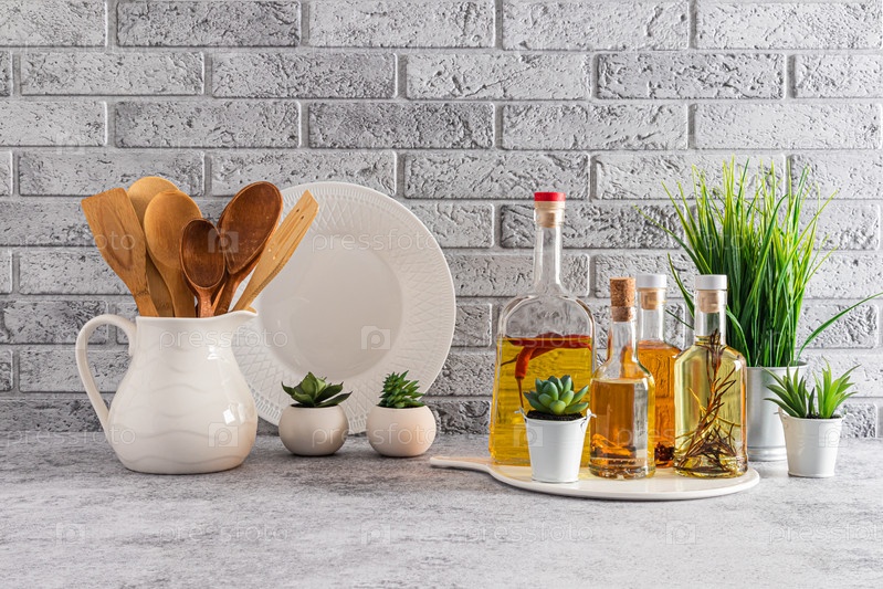 Стеклянные бутылки с различными видами масла на кухонной столешнице в интерьере современной кухни с зелеными комнатными растениями. Серая кирпичная стена