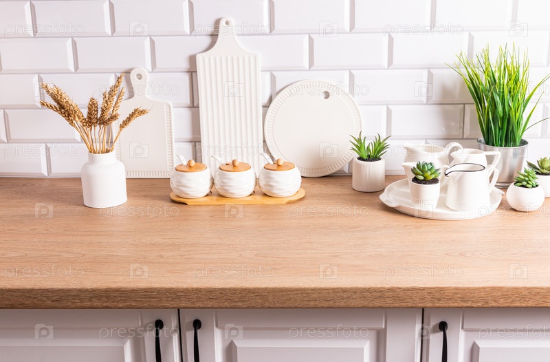 Белая кухонная утварь, разделочные керамические доски и посуда, ваза с початками кукурузы в интерьере современной кухни в белых тонах