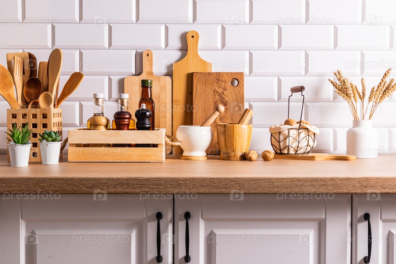 Вид спереди на кухонную деревянную столешницу с набором различной кухонной утвари и экологически чистых предметов. Дом без отходов